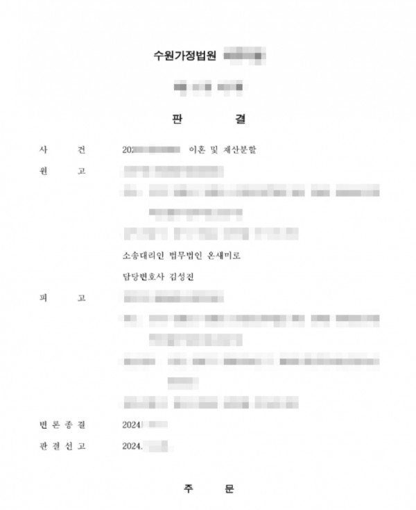 의뢰인의 부정행위를 남편이 알게 되었는데 남편은 지속적으로 의뢰인에게 폭행과 폭언을 했습니다. 의뢰인은 상대방의 부당한 대우를 견디다 못해 이혼 및 재산분할 소송을 제기하였습니다. 상대방은 의뢰인이 유책배우자라며 이혼을 기각해 달라고하였습니다. 재판부는 의뢰인의 청구를 받아들여 이혼을 인용하였고 상대방은 의뢰인에게 재산분할로 약 3억원 이상을 지급하라고 판결하였습니다.