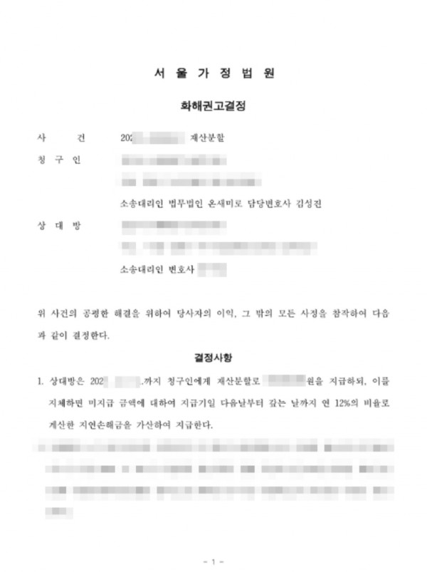 의뢰인은 상대방과 20년간의 사실혼을 해소하였는데 의뢰인이 상대방에게 사실혼 동안 형성한 재산을 분할하자고 하자 상대방이 이를 거절하여 재산분할 청구를 하였습니다. 상대방은 사실혼 해소를 부정하고 의뢰인은 재산형성에 기여한 적이 없다고 주장하였습니다. 재판부는 의뢰인의 재산형성 기여도를 인정하여 상대방이 의뢰인에게 재산분할을 지급하는 화해권고결정을 내렸습니다.